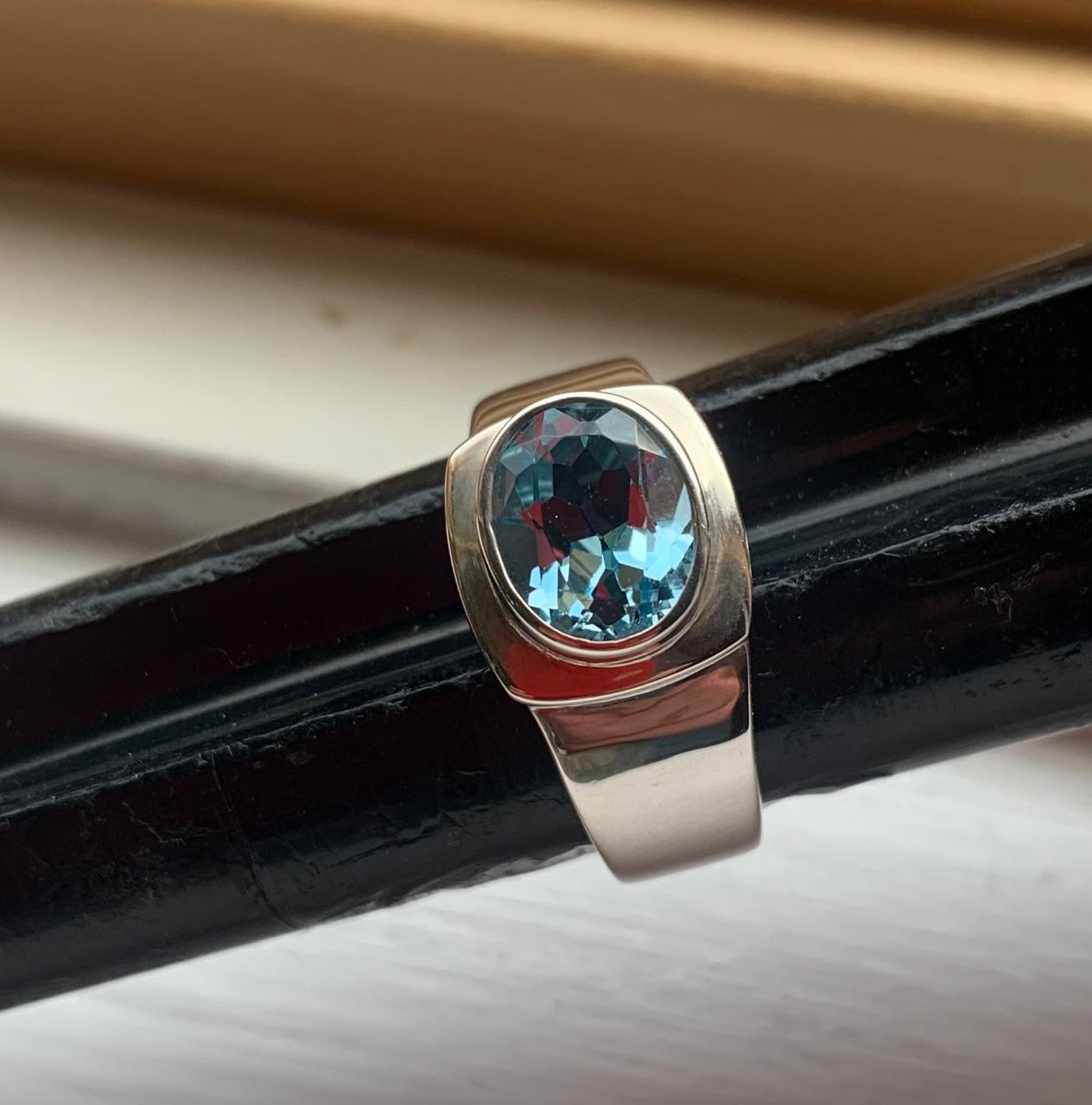 Anel em prata 925 com acabamento polido e design contemporâneo, destacando uma pedra de topázio azul de brilho intenso.