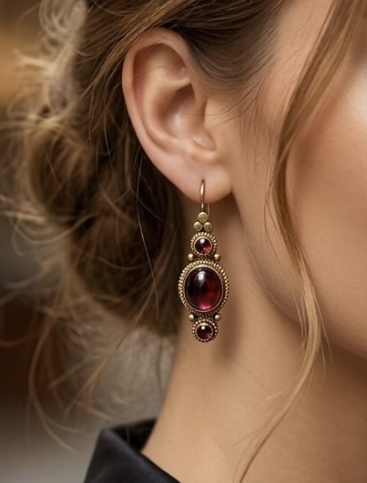 Elegantes e atemporais, estes brincos em prata 925 com banho em ouro 22k destacam a intensidade das pedras granada em lapidação cabochon. O design valoriza a profundidade do vermelho, trazendo sofisticação e personalidade para composições refinadas. Uma peça que equilibra tradição e modernidade com excelência artesanal.