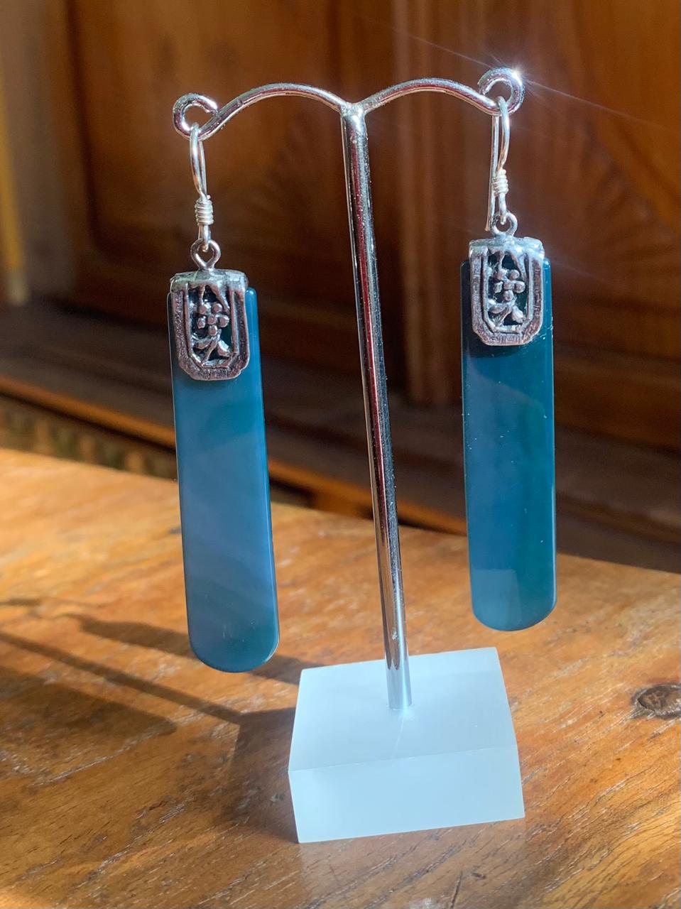 Brincos em prata 925 com design alongado e moderno, compostos por pedras naturais de ágata verde.