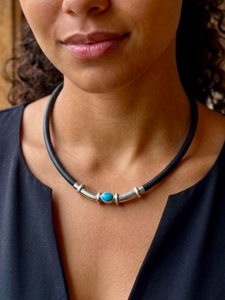 Este colar combina a sofisticação da prata 925 com a energia única da turquesa, uma pedra ancestralmente conhecida por suas propriedades de proteção e conexão espiritual.